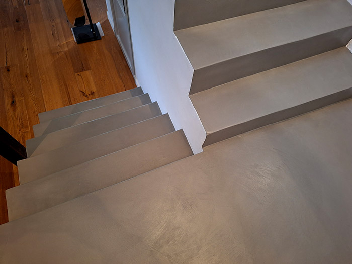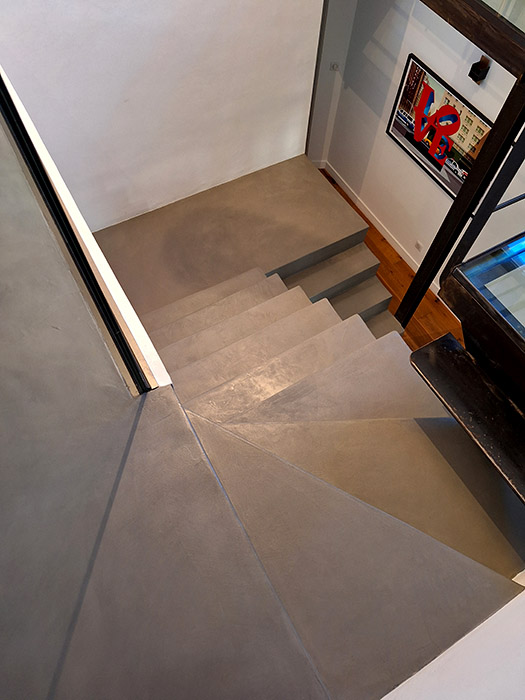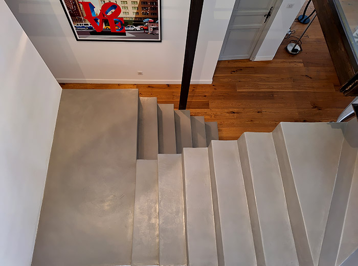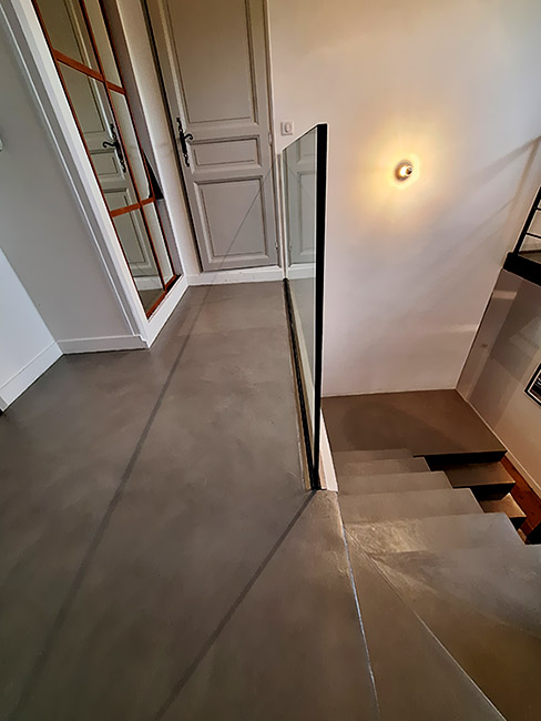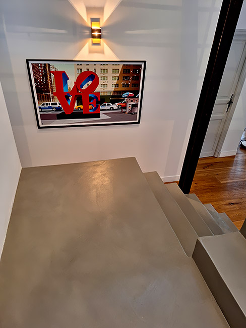Pour ce projet, La demande de mes clients était de relooker un escalier en béton ciré dans un style contemporain, chaleureux et urbain, en ton gris béton ciré.