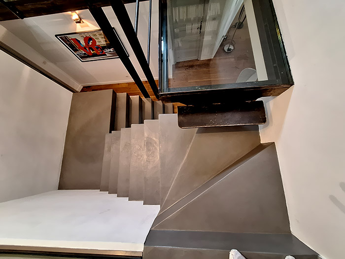 Un escalier gris en béton ciré qui s’intègre parfaitement à l’architecture intérieure